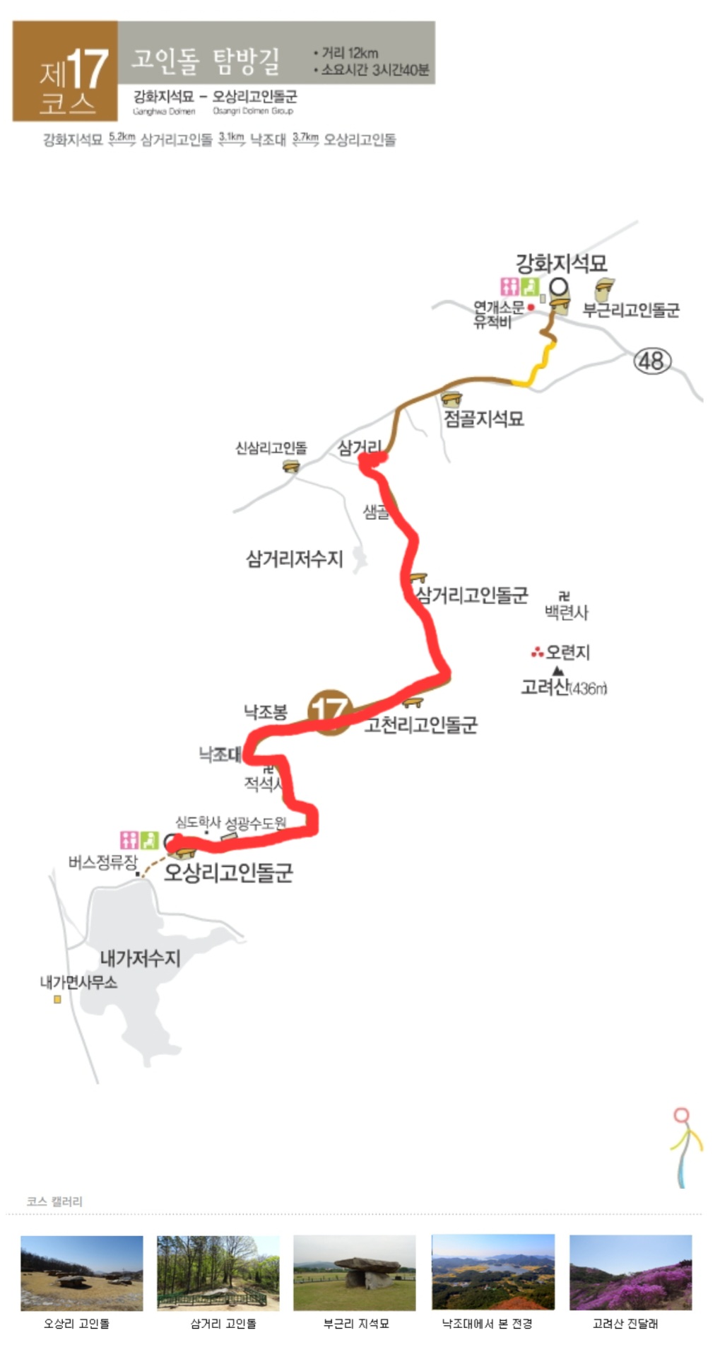 * 코스: 삼거리고인돌 - 고천리고인돌 - 낙조대 - 오상리고인돌 (7.5km, 난이도: 상)
