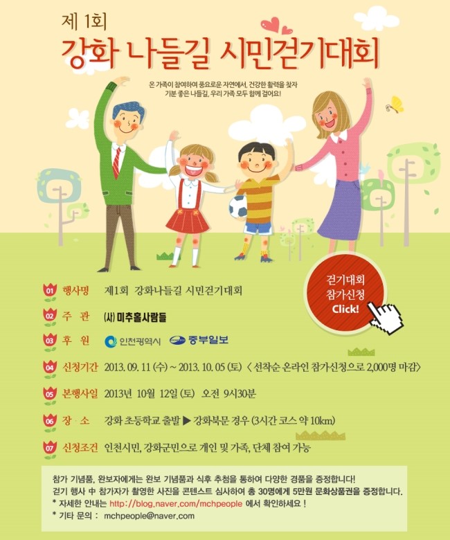 * 강화나들길 걷기에 참석하여 다양한 사진을 찍어 mchpeople@naver.com으로 제목 "사진콘테스트"하여