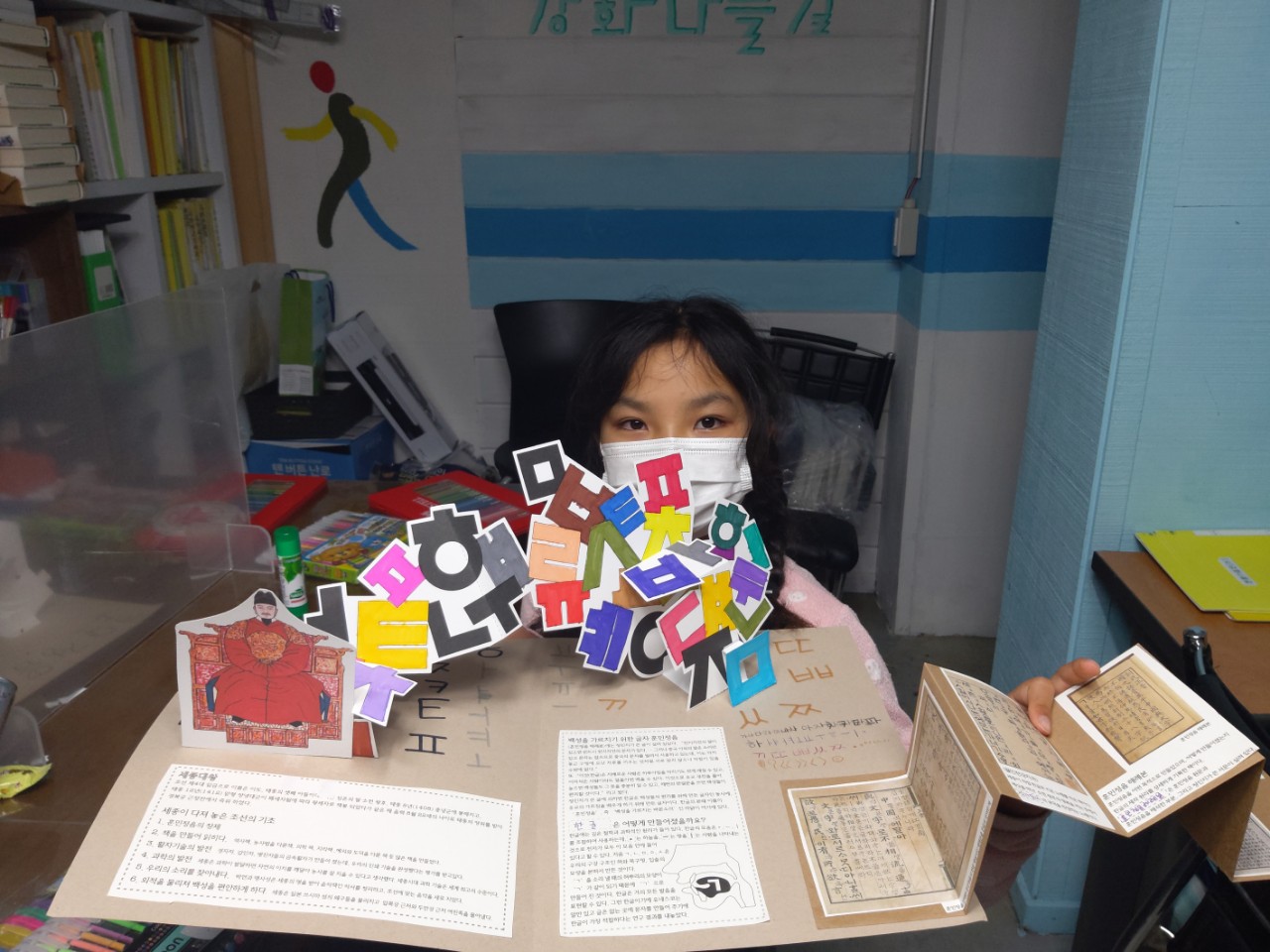 조선시대 왕인 세종대왕의 업적과 훈민정음의 탄생과정을 알아보고 책속의 책 형태로 아코디언 미니북과 한글자음과 모음을 이용해 180도 팝업북을 만들면서 한글의 소중함에 대해 생각해 보는 시간을 가졌습니다.